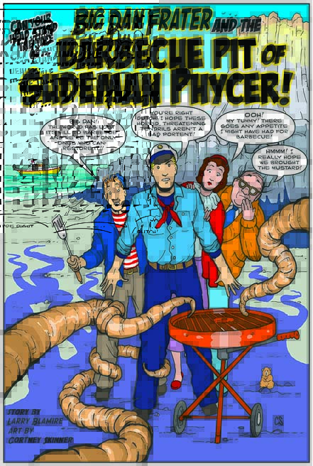 For Larry Blamire's third movie, "Trail of the Screaming Forehead" I created two fun illustrated comic book stories starring three of his characters from the film.The story was written and scripted by Larry Blamire. This story was a Lovecraft-inspired tale, "Big Dan Frater and the Barbecue Pit of Sudeman Phycer!" For these two stories, my style was inspired both by C.C. Beck (Captain Marvel) and Hergé (Tintin). < Previous | Back to gallery | Next > |