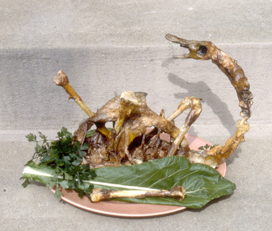 |  | Three-Dimensional  Commissioned by a Boston Theater company for one of their plays, this prop was made of chicken bones, paper maché, acrylic gel medium and a fresh leaf of Romaine lettuce from the garden.< Previous | Back to gallery | Next > |  |
