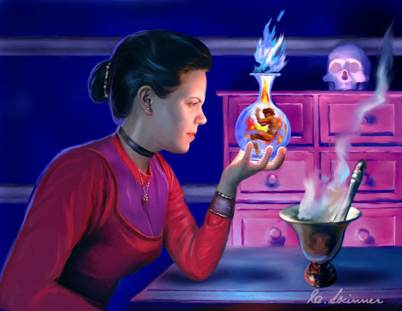 Created for a collectable card game that was cancelled by the publishers while in production, this artwork was a great deal of fun to create even though it would never be used. It would have been printed at approximately 1" x 2" on a gaming card, so it needed to clearly show the iconic representation of a person well versed in the arcane medical arts. An attractive and mysterious protagonist, dramatic lighting, a tiny homunculus in a flask, an ancient medical cabinet, a skull...all help to set the scene clearly.