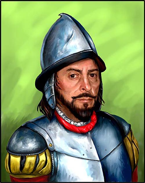 Lucas Vasquez de Ayllon (approx. 1474-1526) - No reference existed for the likeness of this French explorer, but authentic clothing and armor had to be researched for this painting. The curator at the Higgins Armory Museum in Massachusetts helped me zero in on the proper helmet for the period and for the country of origin of this explorer of early America. © Scott Foresman/Pearson Education. < Previous | Back to gallery | Next > |