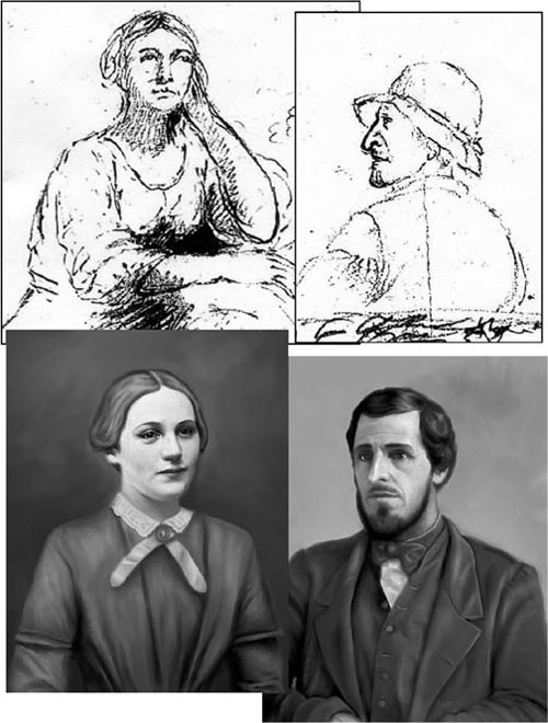 One of my favorite things is to try to make living, breathing flesh-and-blood images of historic people from sketchy reference or scant evidence. The two drawings at the top show original period drawings made of the missionaries Narcissa and Marcus Whitman ca.1847, only days before being killed by local Native Americans. These likenesses were the only ones known to exist. I tracked them down at the Royal Ontario Museum and then created the paintings below. I wanted to capture a resemblance to the sketches, show them in correct period clothing and also simulate or evoke the look of period photography. ©Published by Scott Foresman/Pearson Education. < Previous | Back to gallery | Next > |