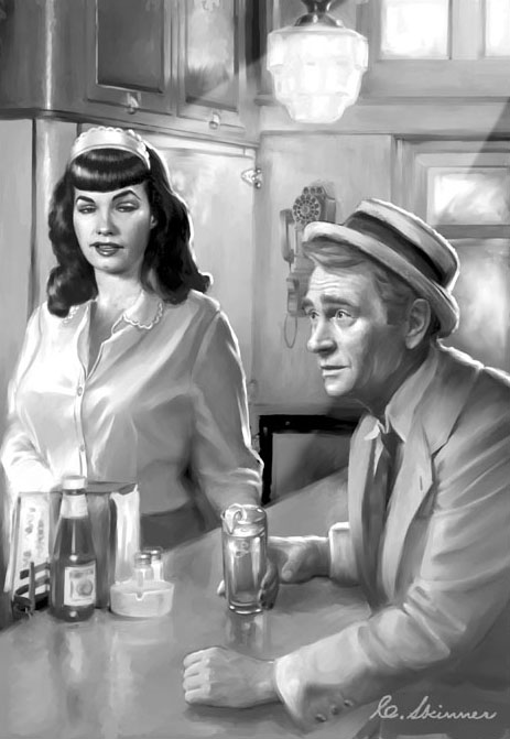 Carl meets a familiar-looking waitress in a nostalgic setting in "Brief Encounter" written by Pierce Askegren. I loved the ambiance of this story, more wistful than horrific. Researching a proper period setting for this sentimental story was a pleasure.