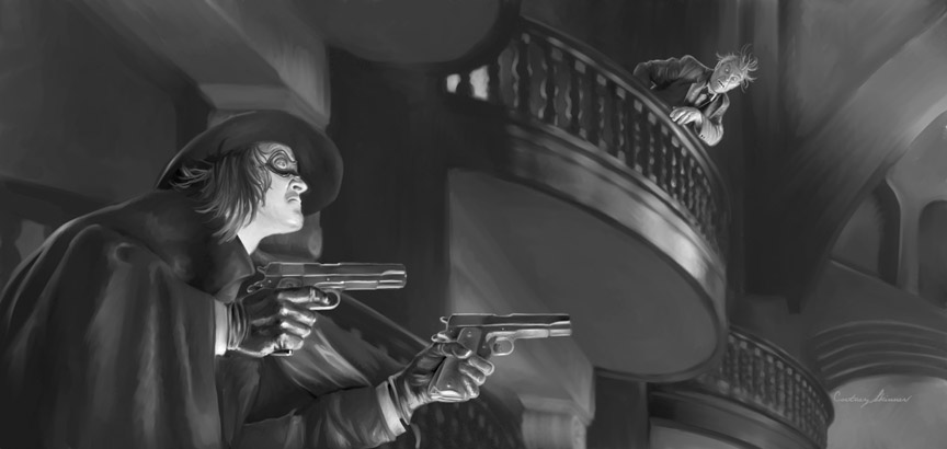 From Moonstone Books, series, "The Spider," the 1930s crime fighter, our hero enters an empty theater as a crazed "Mr. Hyde" villain looks on.
