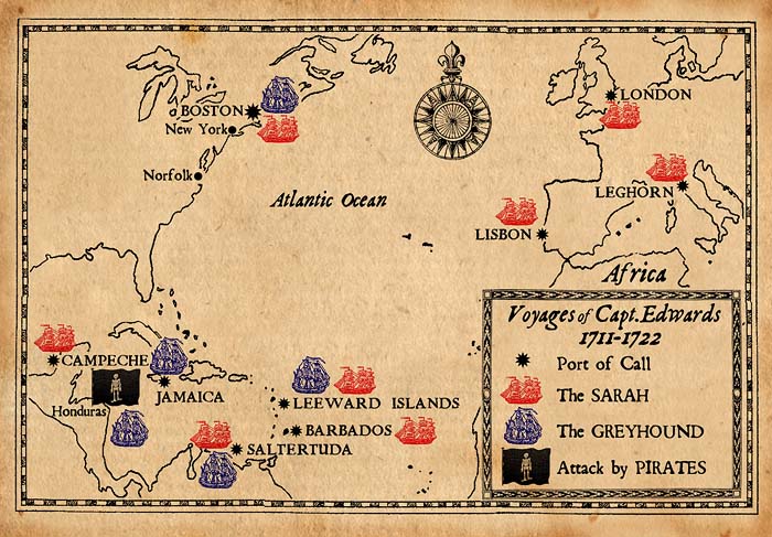 Created for author and historian Ben Edwards, this map portrays the voyages of his ancestor, Captain Benjamin Edwards master of the ship Sarah, a 60 ton vessel built in Boston. His final voyages occurred aboard the Greyhound from 1718-1722. This 110 ton ship had 6 guns and a crew of 14 men. He was attacked and commandeered by the famous pirate George Lowther. I used authentic period graphics from newspapers in my collection and gave it a yellowed paper texture to recall that era of pirates and sail.