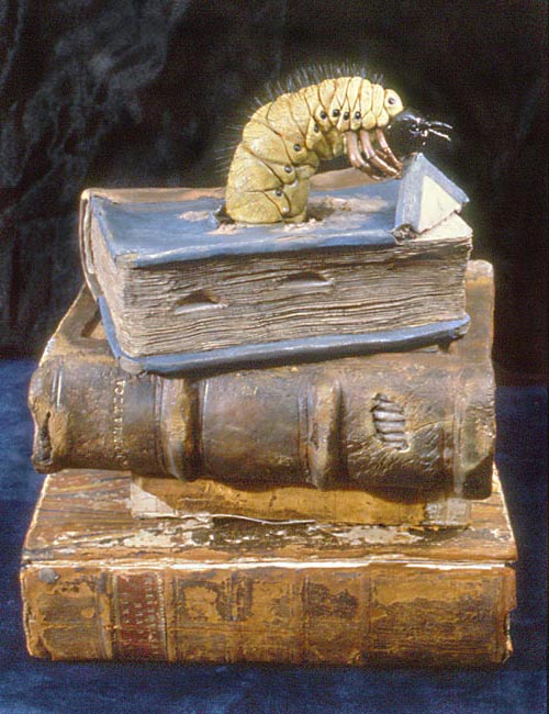 I found a terrific photo of a cellulose-eating worm discovered in an antique piano, and wanted to sculpt a jumbo sized version, but then needed a context for him. The name of the sculpture and his context both occurred to me at the same time. The only real book in this photo is the bottom one, a 1731 Latin Old Testament. The other books are sculptures.